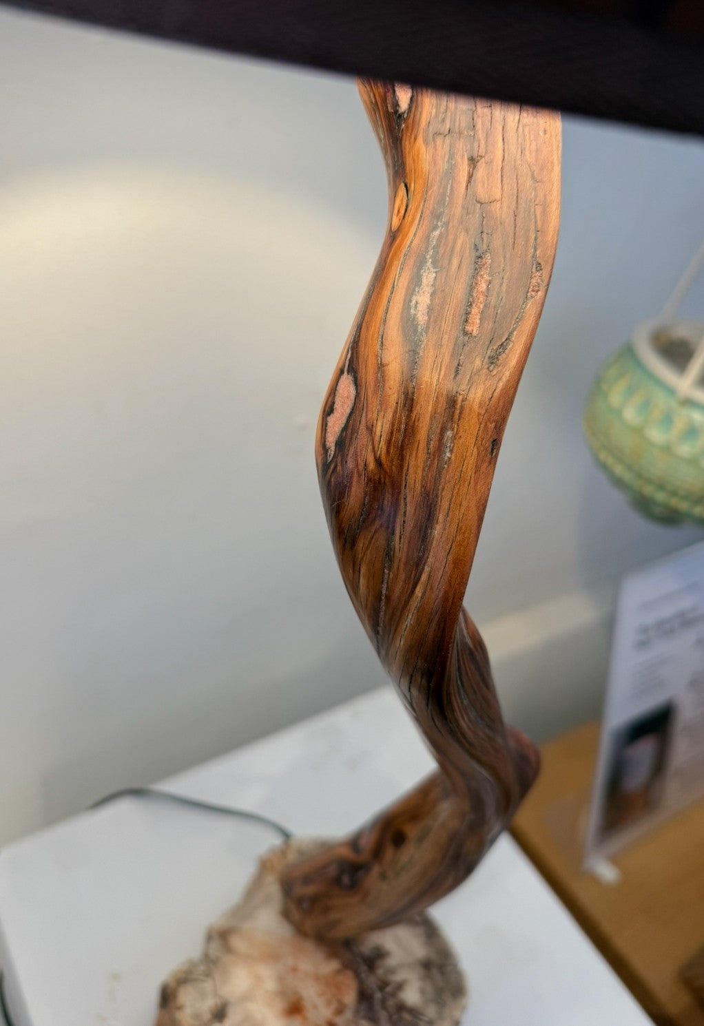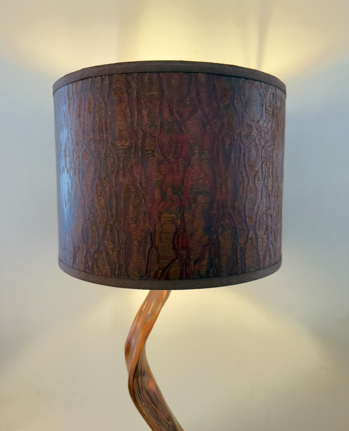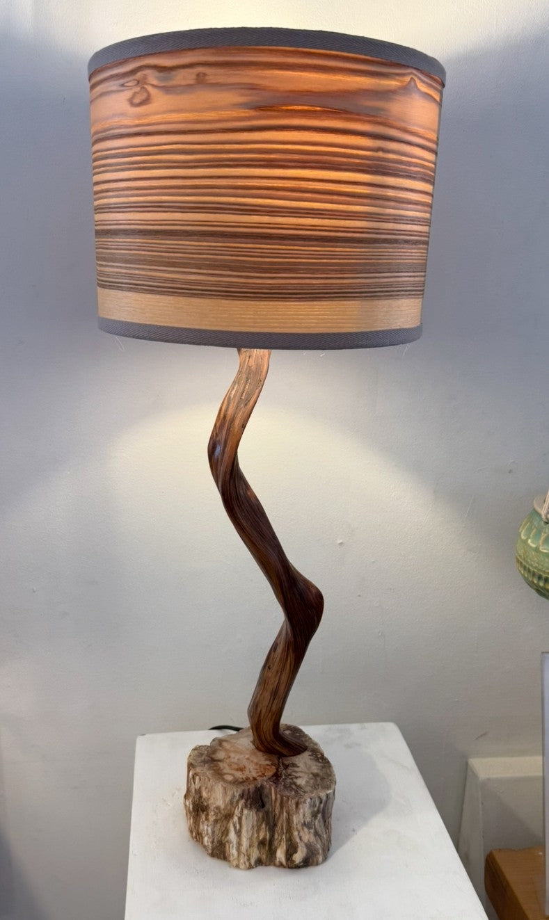 Arizona petrified wood, Tahoe manzanita stem with inlaid thulite in natural features, European ash or makore pommele veneer shade. Additional custom shipping charges will be applied after receiving shipping address.