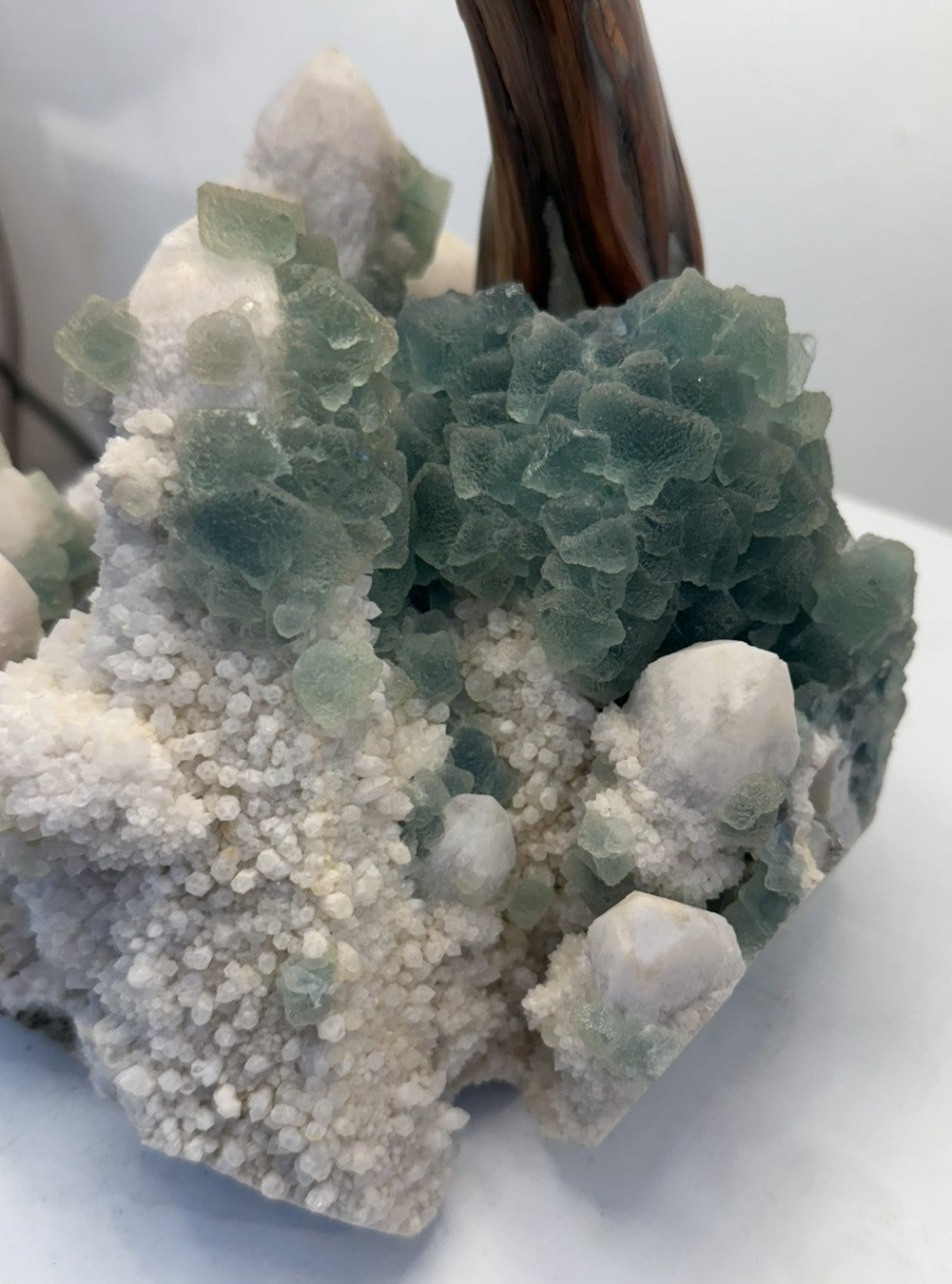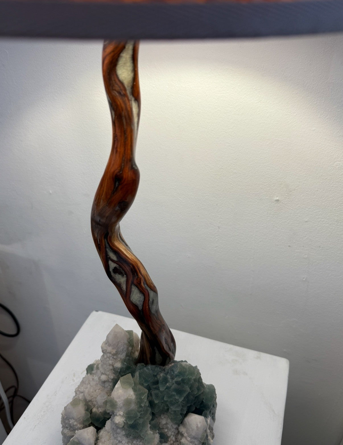 Mongolian fluorite on candle quartz (rare), Tahoe manzanita stem with inlaid aventurine in natural features, Japanese ash veneer shade Additional custom shipping charges will be applied after receiving shipping address.