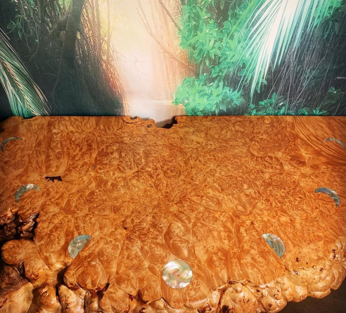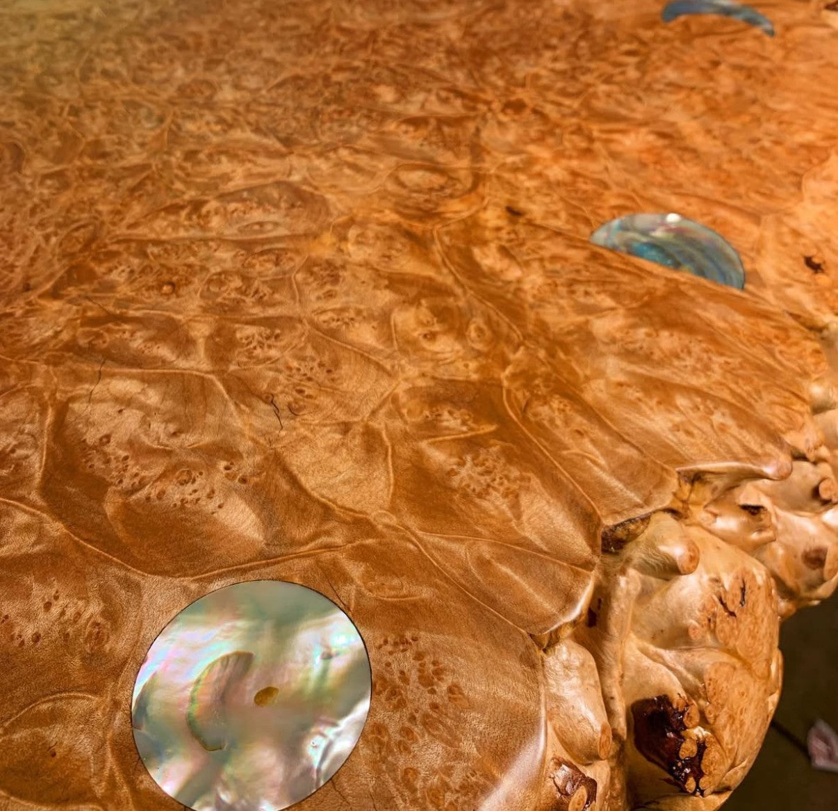 Northern CA maple burl, inlaid abalone moons, Australian mookaite jasper sphere (representing sun or venus), welded steel. Custom shipping charges will be applied once shipping address is received.