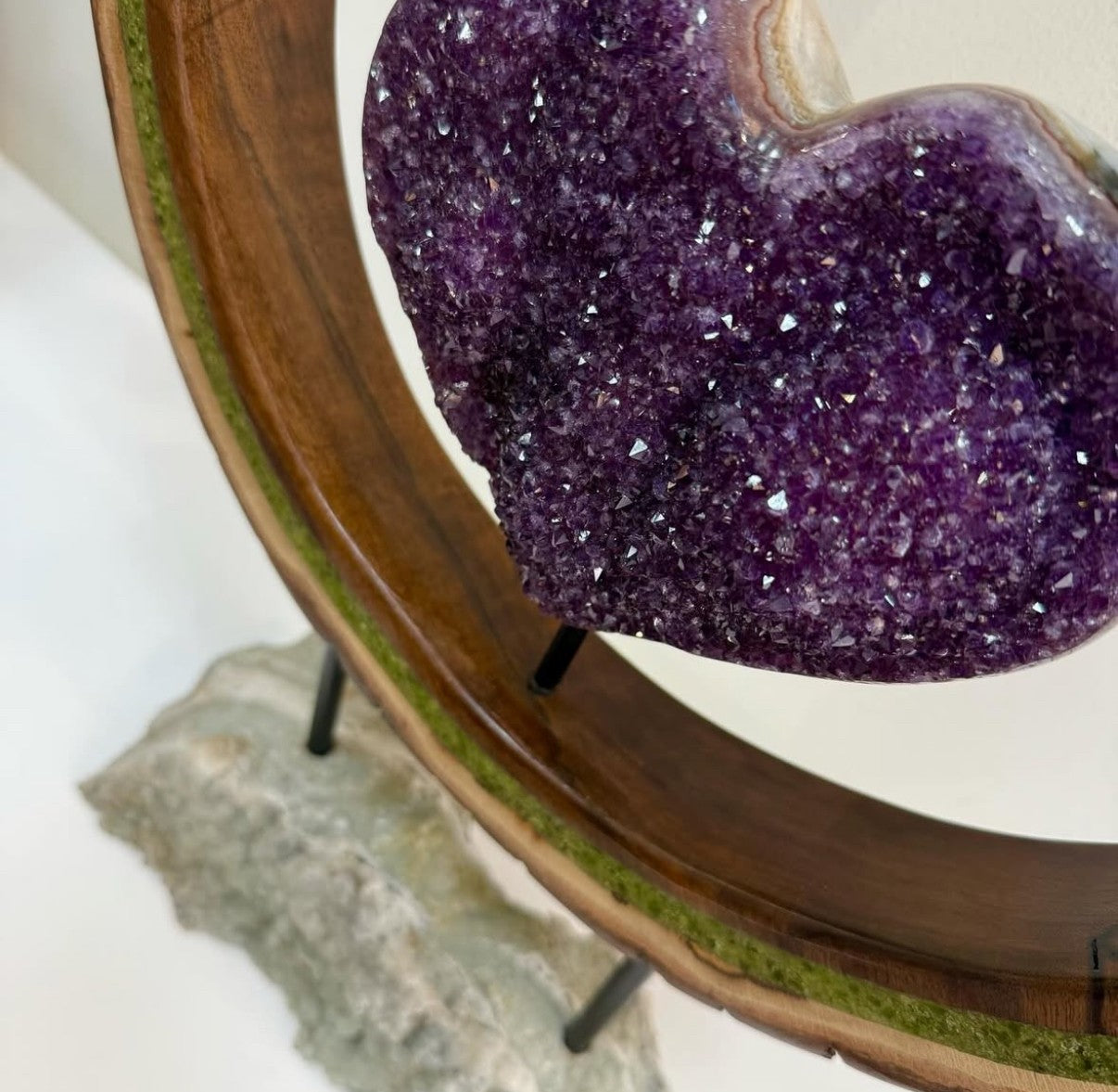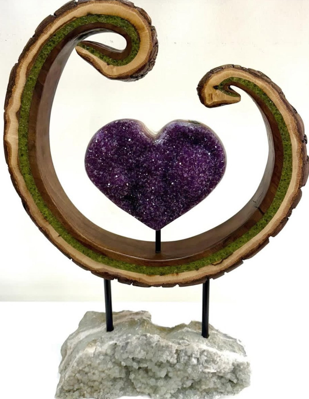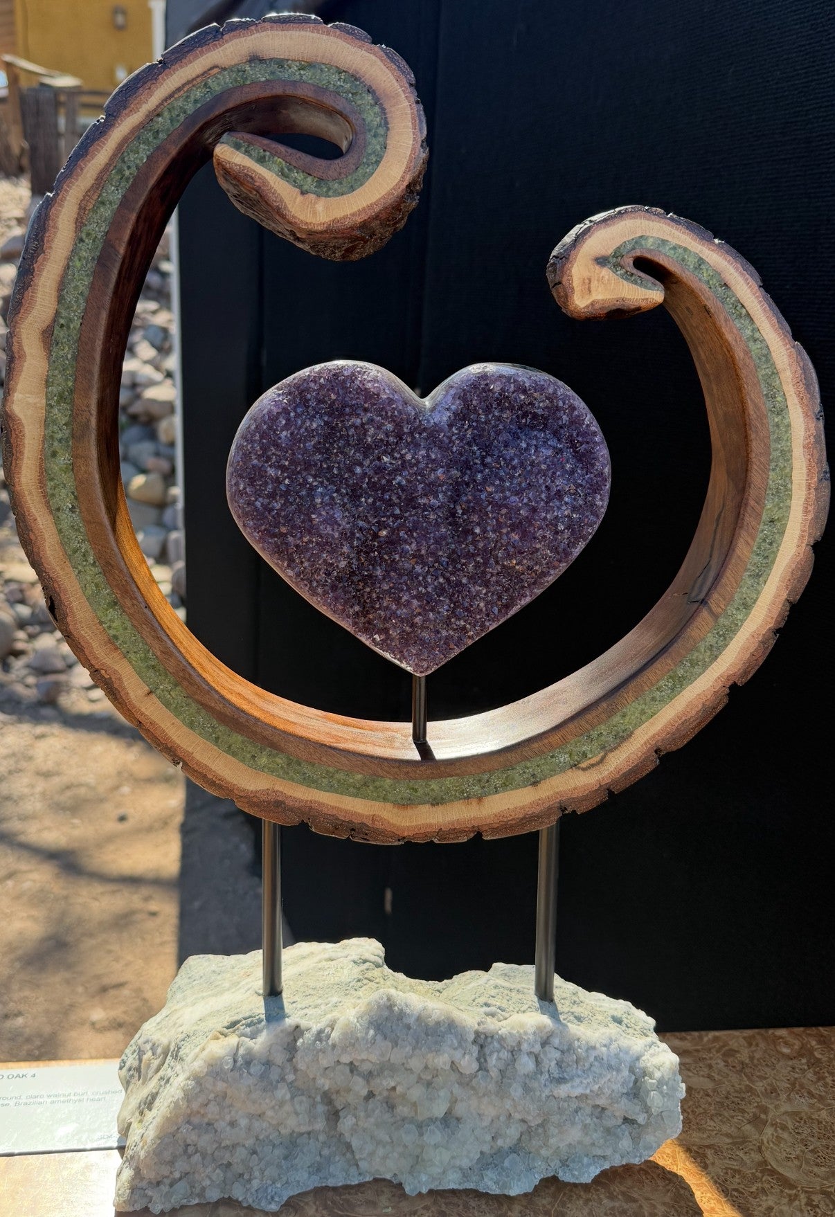 N. California oak round, claro walnut burl, crushed peridot, fluorite base, Brazilian amethyst heart, steel. Custom shipping charges will be applied upon receiving shipping address.