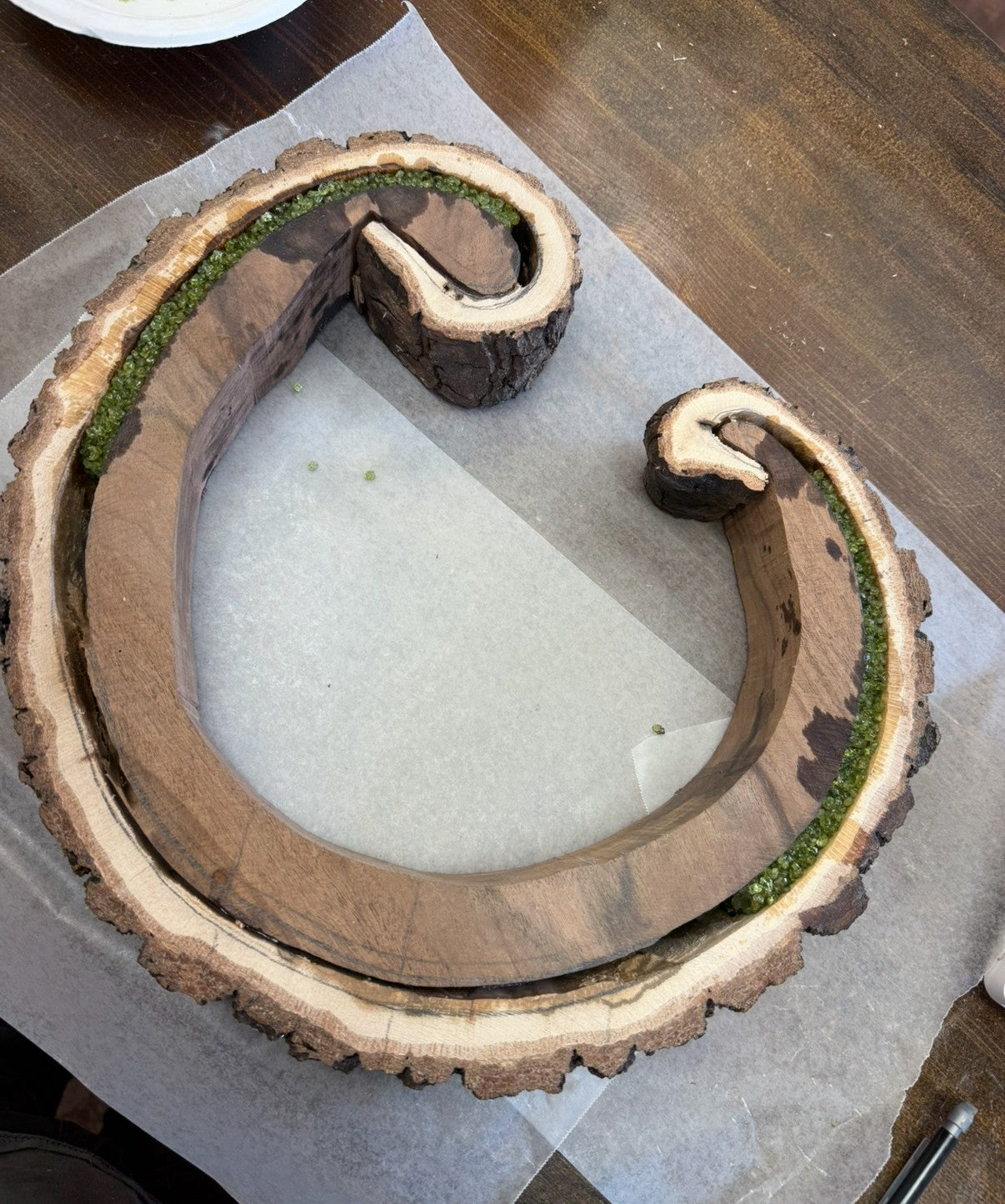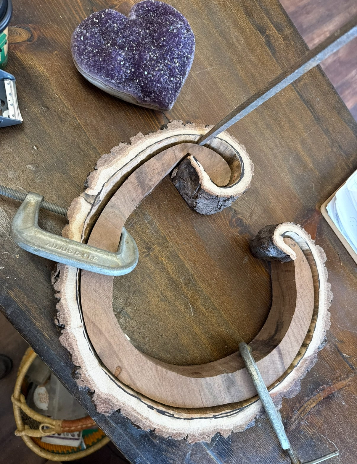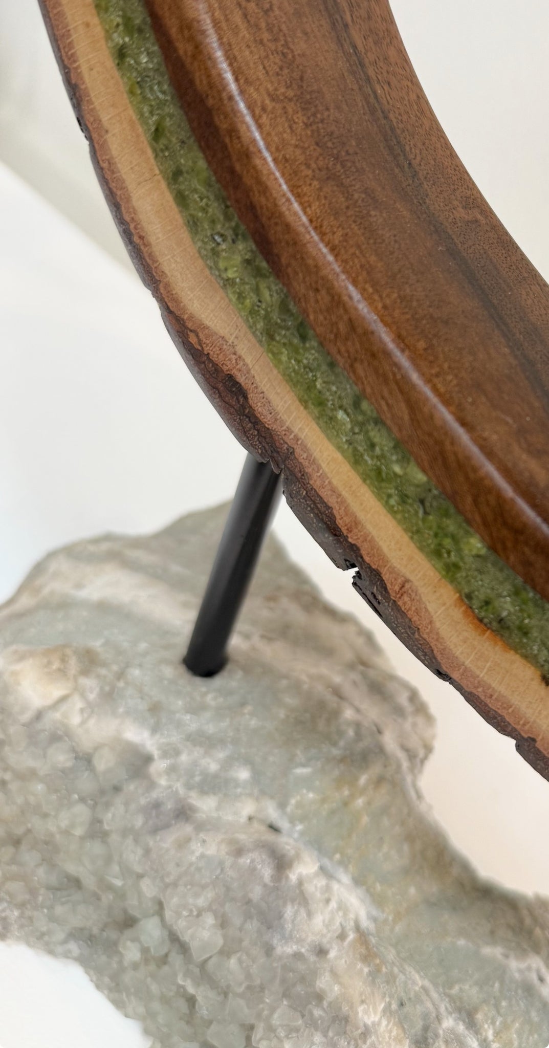 N. California oak round, claro walnut burl, crushed peridot, fluorite base, Brazilian amethyst heart, steel. Custom shipping charges will be applied upon receiving shipping address.